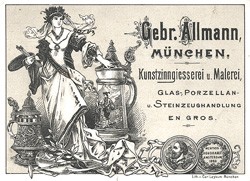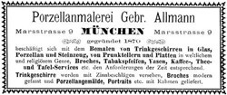 Advertisement from the catalogue of Munich's 3rd International Art Exposition, dated June 1888. Porzellanmalerei Gebr. Allmann Marsstrasse 9, München. Founded 1870. We deal with the painting of drinking vessels in glass, porcelain and earthenware, ceremonial dishes and plates in secular and religious genres, brooches, tobacco pipes, vases, coffee, tea and table services, etc. in the latest styles. Drinking vessels are fitted with modern pewter lids, brooches with modern settings and the porcelain is painted, portraits etc. are supplied with frame.