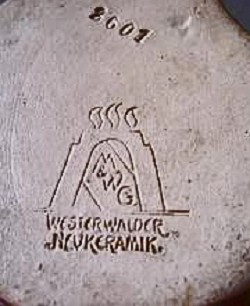 Impressed mark. M&W,G "Westerwalder Neukeramik", on the base of the Satyr stein #2601, attributed to Peter Behrens.
