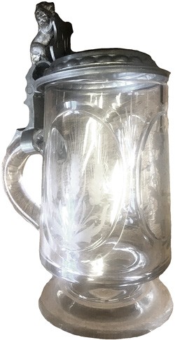Pressed glass stein with pewter lid and porcelain lid insert. The thumpull is a lion rampant behind a shield.