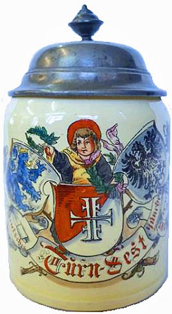 Stein commemorates the 7th German "Turnfest" held in Munich, dates: 27th-31st, July 1889. Stein was manufactured by Dorfner & Co.