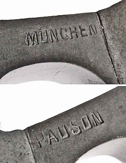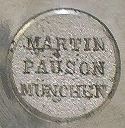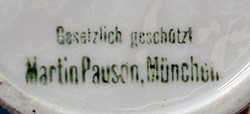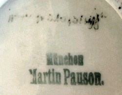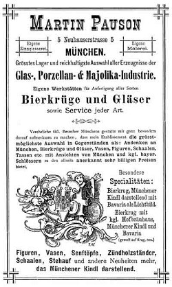 Martin Pauson was born on 8 June 1861 in Redwitz an der Rodach, Bavaria. He arrived in Munich on the 1st April 1880, to seek his fortune, and subsequently opened his business on 5 November 1884, at Neuhauserstraße 5, as a wholesaler and retailer of kitchenware, dinnerware and other household products. Beer steins were an important part of his operation by 1888. The 3rd International Art Exposition was held that year in Munich. The illustrated catalogue for the exhibition included a Pauson advertisement in the Advertisement Artwork section. (See picture, top left)
