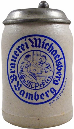 Marzi & Remy plain stoneware 0.5 litre stein,"Brauerei Michaelsberg, Bamberg", c/w pewterer's signature, "P. Pretti, Bamberg".