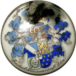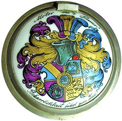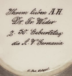 Student stein lid of the Akademische Verbindung Germania. Founded on 3/11/1871 as a Chemischer Verein (Chemical Society) not as a fraternity, but as a society for students and professors of chemistry in Stuttgart. The name A.V. Germania, as a fraternity, was used between 1919 to 1930, also 1950 to date. References: A.V.Germania.1 A.V.Germania.2