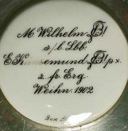 Artist's signature on underside of the lid on a Tübingen hedgehog glass stein lid insert, shown above, dated Xmas 1902.