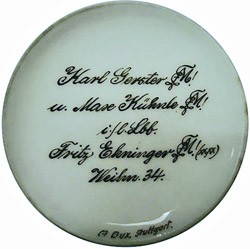 Artist's signature on underside of the lid on a Tübingen hedgehog glass stein lid insert, shown above, dated Xmas 1934.