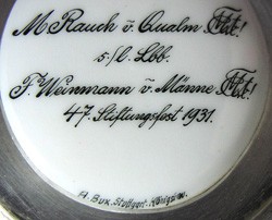 Artist's signature on underside of the lid on a glass stein lid insert, shown above, dated 47 Stiftungsfest 1931.