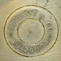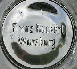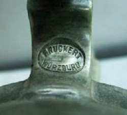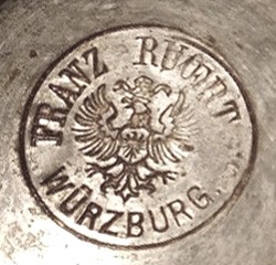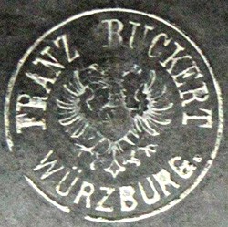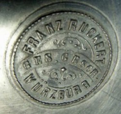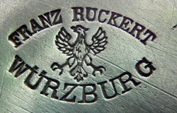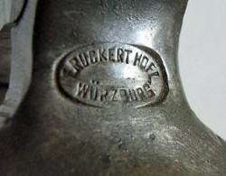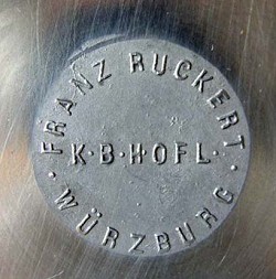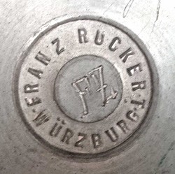 Franz Adam Ruckert was born in Würzburg on March 23, 1829. He was the son of Martin Ruckert, (b.1784 - d.1859), whose father, Philip Theodore Ruckert, (b.1754), grandfather, Johann Georg Friedrich Ruckert, (b.1705) and great grandfather Friedrich Ruckert were all Zinngießermeisters. Franz served his apprenticeship with his father between 1844 and 1847 and became a Zinngießermeister in 1852. In 1853, he received his commercial licence and took over the running of his father's workshop at Blasiusgaße 13. This he inherited in 1859. Franz's son, Ludwig Nikolaus Ruckert was born on December 19, 1870. Franz died on 4th February 1892 and the business was transferred to his widow. In 1894, Ludwig became the owner both of Blasiusgaße 13, and owner of his father's businesses, including Zinngußwarenfabrik Franz Ruckert. He was awarded on the 7th March 1908 the status of Königlich Bayerischer Hoflieferant by King Otto. Also in 1908, Zinngußwarenfabrik Franz Ruckert was sold to
