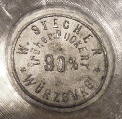 Cast mark dedicated to Café Sauter, Houston, made and imported to the USA between 1911 - 1914. "W. Stecher, früher (formerly) Ruckert" This would indicate that W. Stecher purchased Zinngießerei Franz Ruckert from the Ruckert group of companies in 1908. Obviously Stecher supplied pewter to the Ruckert company after this date, and possibly before this date as a subcontractor.