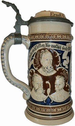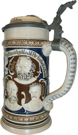 Side panels of featured stein showing faces of Wilhelm Liebknecht, Paul Singer & August Bebel."Nicht betteln nicht bitten nur muthig gestritten." Don't beg, don't pray only courageously dispute.