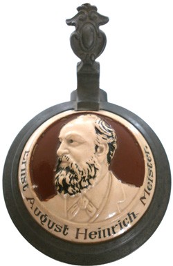 Lid top of featured stein showing the face of Heinrich Meister