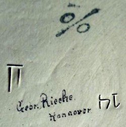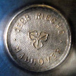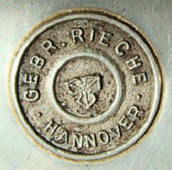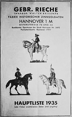 August Ludwig Rieche (b.10th Oct.1839 in Sarstedt - d.28th Feb. 1893 in Hannover) was apprenticed to Georg Friedrich Harnisch. Afterwards he worked for Johann Ernst Dubois until in 1866, he founded his business in Heiligerstraße 6, once he had become a Zinngeißereimeister. This address still exists today. It was situated on the corner of an alley, Spreenswinkel, which was a notorious "red light" area. In 1903 the company was taken over by August's sons, Ernst, August and Franz (b.1880 - d1939). Franz was the mould designer for the military figures. After 1918, the marketplace required historically correct designs, which Franz obtained from old paintings and books. These he sculpted and engraved into figures, which went to create the moulds. The resulting castings were usually decorated by outworkers. There was also a Leopold Rieche, probably a relative of the Rieche brothers, who was considered to be a master decorator. Around 1925, the company was taken over by Walter Beißner, at a similar time to their move to Osterstraße, with Franz staying on until his death in 1939. The shop at No.76 Osterstraße was larger than the one in Heiligerstraße, having two display windows, plus a separate workshop in a yard across the road at No.54. The business ended when the street was bombed in October 1943.