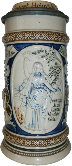 This stein, dated after 1903, is dedicated to the "Sozialdemokratische Partei Deutschlands (SPD)", Social Democratic Party of Germany. Those who contributed to its philosophy and founded the organisations which merged to eventually create the SPD in 1890, are shown on the side panels and lid. "Das Banner der Humanität" The banner of humanity "Wahrheit, Freiheit, Glieichheit, Brüderlichkeit" Truth, Freedom, Equality, Brotherhood. "Proletarier aller Länder vereinigt Euch" Proletariat of all lands unite. The seeds of this organization were founded in 1863, but it was outlawed by Bismarck, between 1878 & 1890, and Hitler between 1933-1945. It was finally resurrected after WW II and is a force in German politics today.