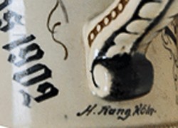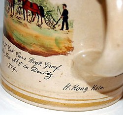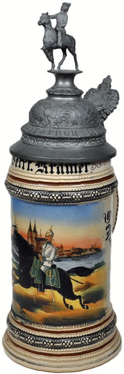"3rd Eskadron. Kürs. Regiment. Graf Gessl rhn. no.8. Deutz". Stein with impressed base mark of Merkelbach & Wick. Decorated for Gefreiter Kramer, winner of the 1st Karabiner Schiels Preis, dated 1902.