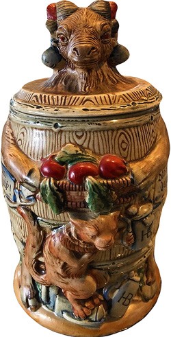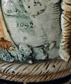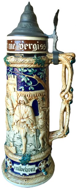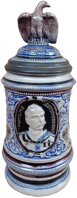 J.W. Remy #308, with three tableaux, each containing a German Emperor, Wilhelm I, Friedrich III & Wilhelm II. 1888 was known as the year of the three Emperors, so this is assumed that this is the date of the stein.