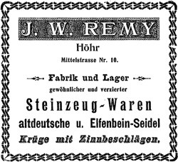 Johann Wilhelm Remy, born in Höhr Germany in February 1833, was from a long line of pottery manufacturers of the area. He founded his company at Mittelstrasse 7 in 1860, producing hand-turned salt glazed designs in a wood-fired kiln. Sons August Wilhelm and Franz Jakob received training at the