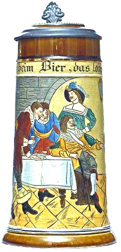 Karl Thewalt to build a coal-briquette-fired round kiln on the Thewalt property nearby. The products from this kiln utilized a recently developed process with a lower firing temperature that provided brighter colors than was possible with salt glaze firing. It required dipping a stein into a glaze slip prior to firing. The resulting fired clay was cream colored leading to the name of ivory stoneware or Elfenbeinsteinzeug. Between 1903 and 1909 the industry was heavily influenced by the Jugendstil styles of