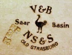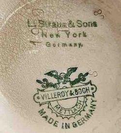 Founded by Lasarus Straus in 1869. In 1882 they created the New York & Rudolstadt Pottery Co. Inc. soley to handle increased business importing finished porcelain items from Europe. In 1893 the Straus family, who by now included Lasarus's two sons, Nathan & Isidor, who had acquired a general partnership with Macy's department stores in 1888, bought out Joseph Wechsler's interest in Wechsler & Abraham, changing the store's name to Abraham & Straus. Nathan renamed the family company to Nathan Straus & Sons, and / or Nathan Straus & Co. in 1924 and continued the business under that name until closing around 1930. Nathan used the "Nathan Straus & Sons" mark on the wares he sold, but it appears he also used N.S. & S. on things as well; for example the Quimper products. One of the sales articles found, are lists showing L. Straus & Sons as selling the Old Strasburg line from V&B prior to Nathan changing the company name. In 1929 - Federated Department Stores, Inc. is formed as a holding company by several family-owned department stores, which includes Abraham & Straus.