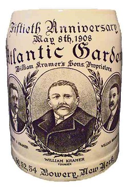 Ink stamp on Villeroy & Boch - Mettlach #1909, 50th Anniversary Atlantic Gardens, William Kramer's Sons. Proprieters. Dated 1908.