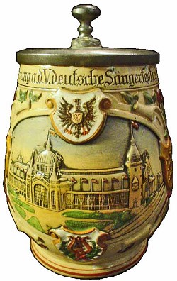 To commemorate the fifth German singing festival in Stuttgart, dated 1896. This stein was probably made by Marzi & Remy, but A.J.Thewalt is also considered.