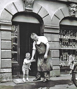 Wilhelm Stecher, with his grandson, Wieland Schätzlein, dated 1940, in front of the pewter foundry, in the picture shown at top.
