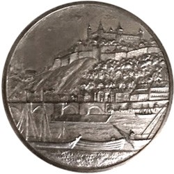 Tableau on the top of pewter lid on the above stein: The Old Würzburg Bridge over the River Main in the foreground and the Fortress Marienberg above.