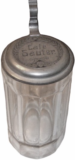 Pressed glass stein probably made by Sachsenglas, complete with lid dedicated to Café Sauter, Houston, made and imported to the USA between 1911 - 1914.