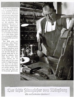 Wilhelm Stecher in his workshop. This is an newspaper article from the Würzburger Generalanzeiger, dated 1938, stating that Wilhelm Stecher is now the sole Zinngießermeister in Würzburg.