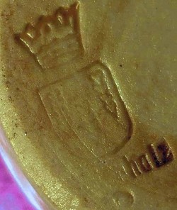 Impressed "Crown & Shield" & Schierholz marks on the base of a pharmacist's mortar, mark dated 1930 - 1950.
