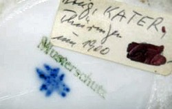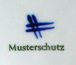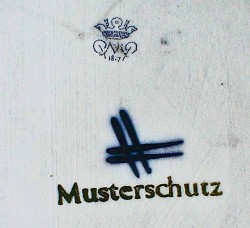 Modern von Schierholz copy of earlier "hash" & Musterschutz marks, together with the current "Crown over PMP" (Porzellan Manufaktur Plaue) stamp.