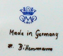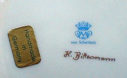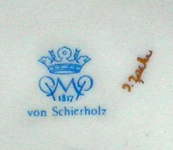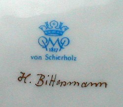 Modern "Crown over PMP" (Porzellan Manufaktur Plaue) plus "von Schierholz" base mark, complete with decorator's signature.