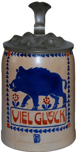 Merkelbach & Wick stein and pewter lid designed by Ludwig Holwein and showing his unique mark, plus decoration no. #62 (Boar) This is just one of a range of twelve designs from 1905 by Holwein. All of these steins had the ubiquitous JR/M (for Josef Reinemann) touchmark on the hinge pin.