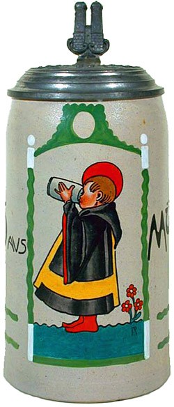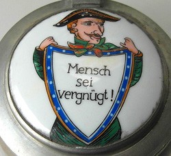 Mensch sei Vergnügt! or Man be Joyful! on the porcelain Insert on the lid of the Spatenbräu brewery stein.