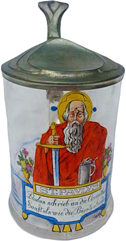 Theresienthal glass stein depicting St Paulus (Paul the apostle) "Paulus schrieb an die Corinthen sauft als wie die Bürstenbinder". A turn of the 20th century idiom, translates thus: Paul wrote about the Corinthians that they drank like fishes.