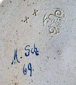 Basemarks showing impressed Merkelbach & Wick, Holwein designed, M.Sch mark and penned decoration number #69 (Tulip design).