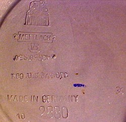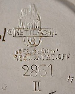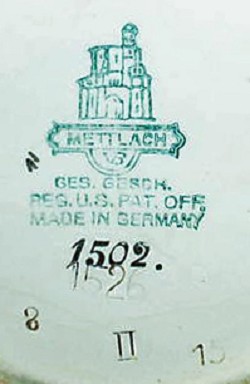 "Mercury" Ink stamp. 1874- 1909. Marked "Made in Germany" due to legislation such as the British Parliamentary "Merchandise Marks Act" of 23rd of August 1887. "Plaque" Ink stamp circa 1888 - 1902. This version dated 1892. The Plaque mark applies only to P.U.G pieces, handpainted from a transfer outline.