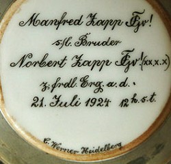Meerschaum for pipe smokers, plus a coat of arms decoration service in their glassware centre. As well as being an arts and crafts workshop, they covered a wide range of luxury goods as well. In 1905 Karl changed his name in the directories to Carl. Circa 1914, Carl retired and the business continued in his name, but with his son, Hans as proprietor. Again, they majored on ivory carving and still supplied the fraternities with decorated steins. Around 1924-1926 they opened a short-lived branch in Leopoldstraße (Friedrich-Ebert-Anlage). Carl died around 1929. With the closure of the fraternities plus the lack of ivory supplies after 1939, they became a general luxury goods store. Little is known about their post-war history, other than I understand they are still in business today with a store in the suburbs of Heidelberg .