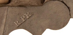 Pewterer's touchmarks on either side of the lid shank of the Saeltzer stein above. Wiedamann is for the pewterer, but R.PR is unknown.