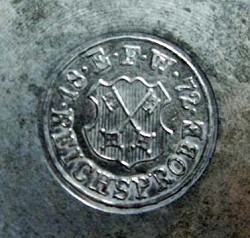 Cross keys are the Regensburg coats of arms, by Eugen Friedrich Wiedamann (b.1874-d.1902). Reichsprobe or Probezinn = 10 parts tin to 1 part lead.