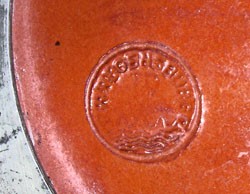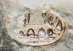 Pewterer's touch mark on the underside of the lid on the Faience stein above.A.F.W.1822 / crossed keys, plus Mermaid / X.22