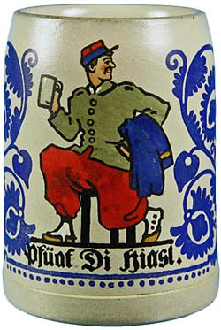 1/2 Litre transfer painted stein, dated 1930, with the Bavarian motto, "Pfüat Di Hiasl", used in this context as, "Goodbye Hiasl". An example of this stein exhibited at the Münchner Stadtmuseum resulted in publication of "Ludwig Hohlwein, Kunstgewerbe und Reklamekunst". Catalogue item #71 on page 98 is the Krug in question, has the photo caption, which reads