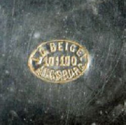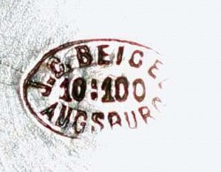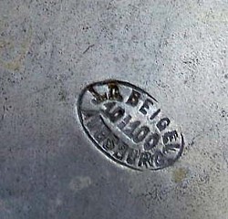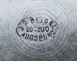 On 28th September 1812, Johann Georg Beigel married Johanna Regina Margaretha Stemmer (b.28/11/1789). Johann Conrad Beigel was born, the tenth of twelve children, on the 22nd March 1823. On the 10th February 1851 Johann Conrad, by now a Zinngießermeister (Master Pewterer) married Maria Wilhemina Johanna Gutmann (b.22/1/1827 - d.8/10/1853). They had a son Johann Konrad Wilhelm (b.29/03/1852). In the second half of 1852, Johann Conrad attended exhibitions principally as a toy (soldiers) maker, to advertise his wares. He remarried on the 14th May 1854 to Rosina Regina Friederike Schreitmüller (b.5/09/1817 - d.25/04/1879). Their home and workshop was at Jakoberstraße H22. They had four children, the second of which, Jakob Johann Conrad Beigel was born 11/12/1857. Johann Conrad became the chairman of the local pewterers. He now used both the the ground floor and the third floor of Jakoberstraße H22. In 1870 they moved to Jakoberstraße G12. On the 19th August 1875 Johann Conrad died, so his wife Rosina took over the business. She expanded the business with their apartment at Jakoberstraße G12, but with their workshop now at Jakoberstraße H19. In 1879 Rosina died and her son Jakob took over the business. In 1895 yet another store was opened at Karolinenstraße C44. In 1906 he again expanded the product range, selling both pewter items and china. 1907 saw the closing of the store at Jakoberstraße H19. From 1909 the Karolinenstraße C44 address was used in conjunction with Hoher Weg 44. By 1913 he had stopped selling pewter items, but was selling only glass and porcelain, solely out of Hoher Weg 44. By 1919 Jakob Beigel was no longer listed in the Augsburg address books.