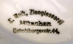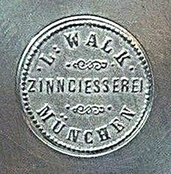 Signature on a Baker's occupational stein, dated 1895. L. Walk. Zinngießerei, München Gabelsbergerstraße 44. Dated prior to 1899.