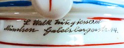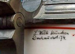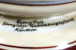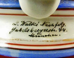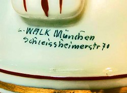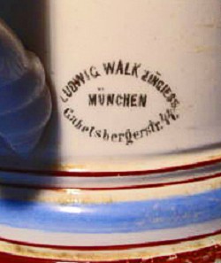 Signature on featured stein above, dated 1896. "Ludwig Walk. München. Zinngießerei-Porzellanmalerei. Gabelsbergerstraße 44".
