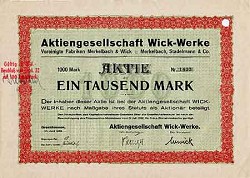One of the 2500 original share documents, valued at 1000 Marks each, when issued, of AG Wick-Werke, signed June 1922. This was revalued on 18/4/1932 to 100 Reichsmarks ()