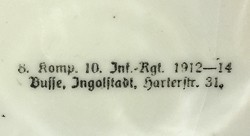 "8th Company of the 10th Bavarian Infantry Regiment". 1912-14, on the base of the stein above denoting service in the unrelated 3rd Bavarian Pioneer Battalion.
