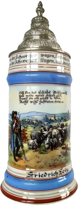 Occupational stein dedicated to a Swiss shepherd, Probably handled and pictorially decorated by Martin Pauson, with written dedication added by Otto Bermanseder?