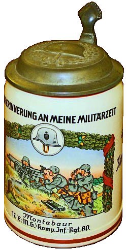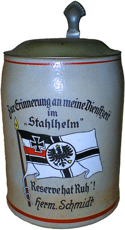 Stein made by Reinhold Merkelbach "Commemorating my period of Service in Stahlhelm". Stahlhelm, Bund der Frontsoldaten (Steel Helmet, League of Frontline Soldiers) was a paramilitary organisation formed in 1918. It was forceably absorbed into the Nazi machine between 1933 and 1935. Use of the old Imperial flag on this stein indicates the pro- Royalist character of the organisation.