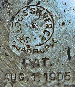 The company first appeared in the St Louis City directory in 1893 as the St Louis Silver Plate Company. Their stein production period, with all items marked St Louis Silver Co., stretched between 1904 and 1912. During this latter period the company moved to 118 Chestnut Street. The patent application of 1904/5 was written by Clarence M. Perkins. The company disappeared from the St Louis City directory in 1912.
