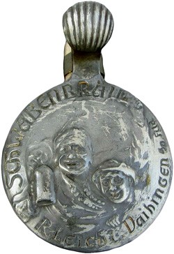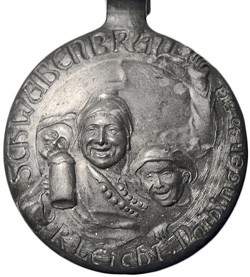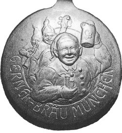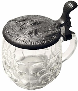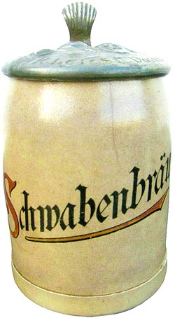 Pewter lid on featured stein, advertising the Schwabenbräu Brewery, which was founded in 1878 by Robert Light in Stuttgart. The Gernerbräu brewery of Munich, commissioned a lid (below) in similar style, with a drinker holding a mug with GB on it and with a couple of musicians in the background.