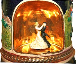 ` The "stage" consisting of the inset, together with the waterproof backdrop and the dancing figures, powered by a clockwork motor underneath.